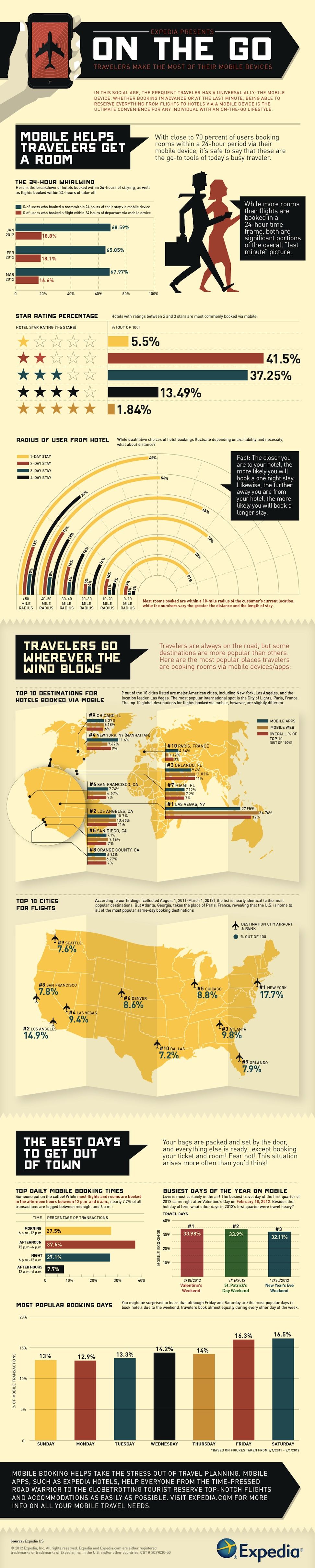 Una recente ricerca di Expedia ha rivelato come sia cambiato il modo di prenotare e come organizzare un viaggio passi dal mobile tech. Nel 1° trimestre del 2012 sono stati prenotati hotels, via mobile, dal 68,59% di turisti (a gennaio) e dal 67,97% (a marzo), così è stato anche per i voli: il 18,8% dei passeggeri a gennaio e dal 16,6% a marzo.
