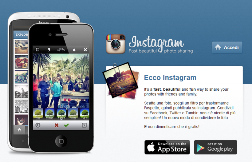 Instagram è un Social Network pensato per condividere gli scatti effettuati dagli utenti con gli smartphone Android e iOs Apple. L’applicazione, scaricabile gratuitamente dalle piattaforme Google Play e App Store, ha da tempo superato i 50 milioni di download e questo rende subito l’idea di quante persone al mondo utilizzano questo servizio. L’applicazione Instagram esalta l’utilizzo delle fotocamere degli smartphone, permettendo all’utente di applicare filtri ed effetti che rendono attraenti anche le immagini più banali.