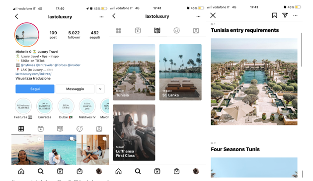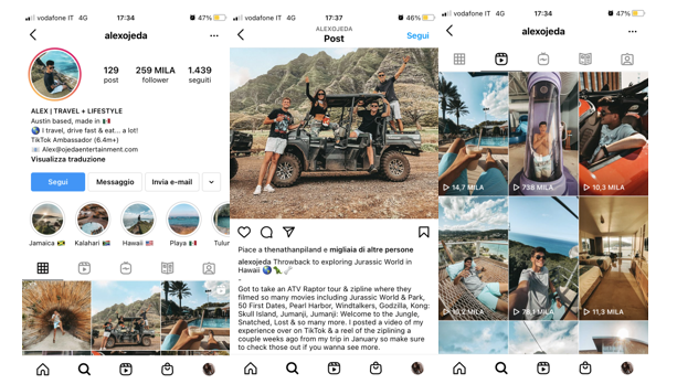 Il feed è riconoscibile con foto di ottima qualità ed uno storytelling convincente, che racconta la bellezza di scoprire nuovi posti nel mondo.