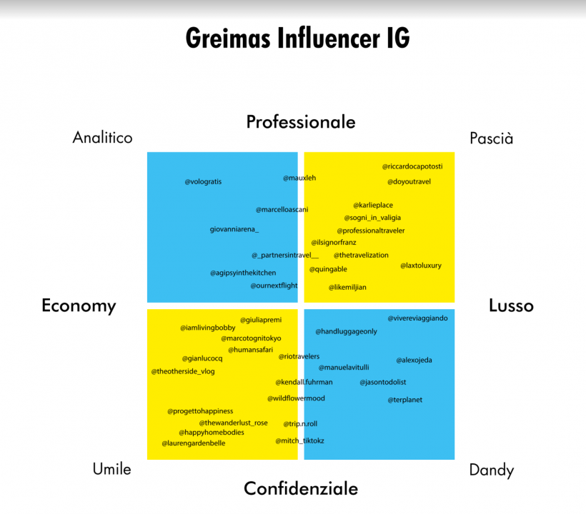 Attraverso uno strumento, chiamato Quadrato semiotico di Greimas, che si utilizza per paragonare il posizionamento dei competitor e di altre realtà affini con il proprio brand, abbiamo disposto tutti i profili scelti in base a due principali parametri di posizionamento.