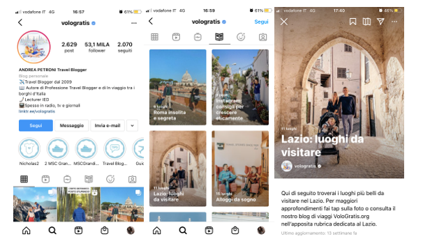 Uso frequente di Reel e IGTV (ordinate in 3 serie). Creazione di una guida e un filtro.
