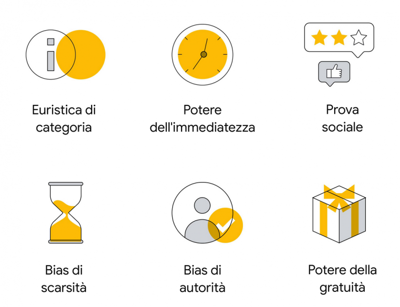 È il caso dei Bias cognitivi. Ce ne sono tantissimi, ma la coppia di analisti del team Google ne indica sei come più influenti nel processo d’acquisto.
