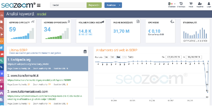 Immagine 4 – Screenshot del sito SEOZOOM L’analisi delle keywords. Sì, tifo Bologna e quando ho fatto questo test aveva appena comprato Medel!