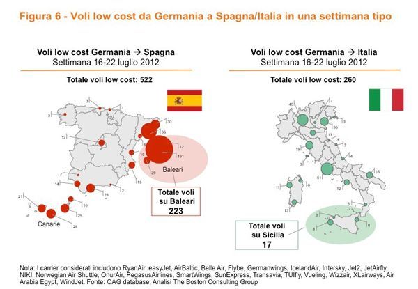 Per la stessa settimana del 2012, ossia tra 16 e 22 luglio, i collegamenti tra Germania e Baleari si attestano a 223, mentre quelli sulla Sicilia sono solo 17. In questo, il Piano ha giocato un po’ contro l’immagine della gestione italiana di quegli anni, portando alla ribalta un numero estremamente povero ed emblematico ma per forza di fonte, attendibile.