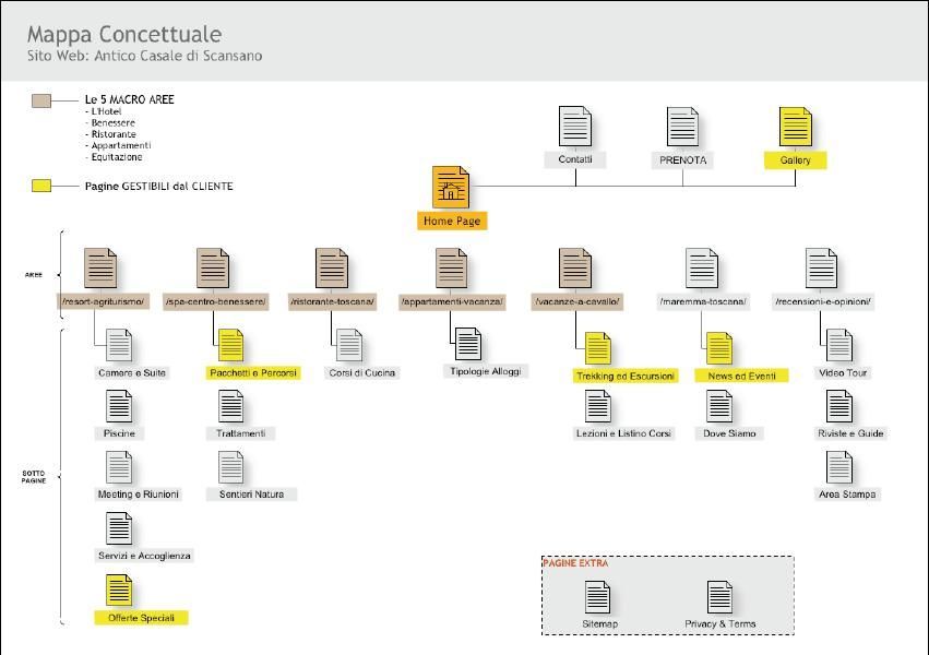 Individui le aree principali del tuo sito, definendo l’area principale (es. l’Hotel), una complementare (es. il Ristorante) e una secondaria (es. il Benessere).