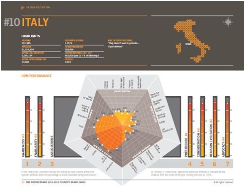 [*il Country Brand Index è lo studio globale di FutureBrand che prende in esame 113 Paesi valutandoli in base a 26 attributi di immagine e a 6 diversi pesi di forza della marca. L’Italia è stata classificata per 2011-2012 al 10° posto grazie alla vera forza del sistema paese Italia sta proprio nei suoi asset storici come la cultura, la cucina, lo stile il turismo, che in questo periodo di globalizzazione rendono l’Italia un vero competitor proprio di quei paesi che hanno una grande stabilità politica. La forza del made in Italy ci consente di promuovere ed instaurare ottime relazioni commerciali in tutti i mercati.]