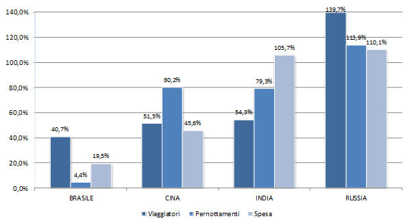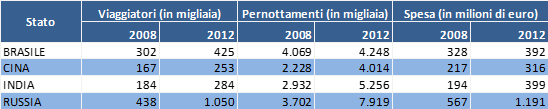 Nel periodo 2008-2012, il trend dei paesi emergenti è stato decisamente positivo, facendo rilevare performance favorevoli sia in termini di viaggiatori alla frontiere, che di pernottamenti, che di spesa turistica. Quasi tutti i paesi, infatti, hanno segnato tassi di crescita a due cifre. La Russia, in particolare, si è distinta grazie a valori che in 5 anni sono più che raddoppiati. Va rilevato, in particolare, che Russia e India hanno registrato le variazioni percentuali della spesa più elevate di tutti i paesi stranieri –non solo dei BRIC- mentre, nello stesso periodo, mercati di breve e medio raggio importanti per l’Italia, come Francia, Spagna e Paesi scandinavi, hanno registrato delle contrazioni.