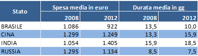 BRIC: Spesa media dei turisti e durata media del soggiorno. Valori assoluti 2008-2012