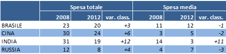 BRIC: posizione nella classica italiana per spesa totale e spesa media dei turisti stranieri in Italia. 2008-2012