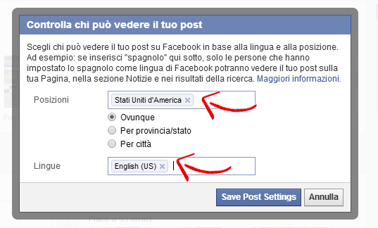 Per aiutarti nella scelta quello che dovesti fare è andare nell’area Insight e capire da dove arrivano principalmente i tuoi fan, anche se sei tu a gestire la pagina presumere di sapere potrebbe portarti fuori strada e farti commettere degli errori banali e superficiali, in particolare in relazione ad una determinata lingua (perciò dagliela un’altra occhiata!!)
