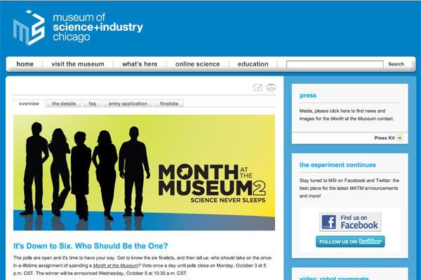 Nell’estate del 2010, il Museo della Scienza e dell’Industria di Chicago ha lanciato un concorso, la cui vincita includeva un’esperienza di permanenza nel museo per 30 giorni, per riferire osservazioni ed emozioni al mondo esterno. Il museo ha offerto al vincitore del concorso un premio di 10.000 $, gadget tecnologici e la nomina a membro onorario a vita del Museo.