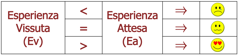 Il confronto tra queste due differenti esperienze genera uno stato d’animo che si traduce in un giudizio. Il consolidamento di un giudizio più o meno positivo avviene in funzione del verificarsi di una delle seguenti condizioni: