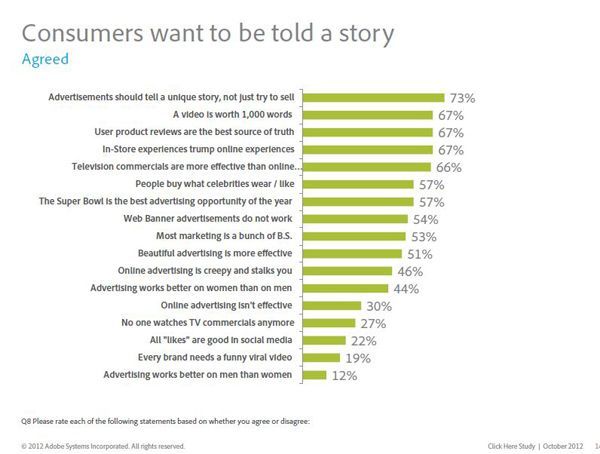 Da questo sondaggio emerge una risposta, valida anche nel 2014, data dal 73% degli adulti intervistati che concordano con questa affermazione: “Le pubblicità dovrebbero raccontare un’unica storia e non soltanto cercare di vendere”.