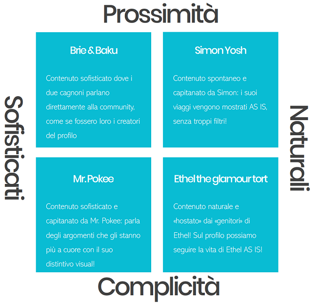 Infatti, i termini verticali del “quadrato a quattro zampe” sono stati cambiati perché tutti i gestori delle pagine degli Animal-Influencer cercano di enfatizzare L’INCLUSIONE della community.