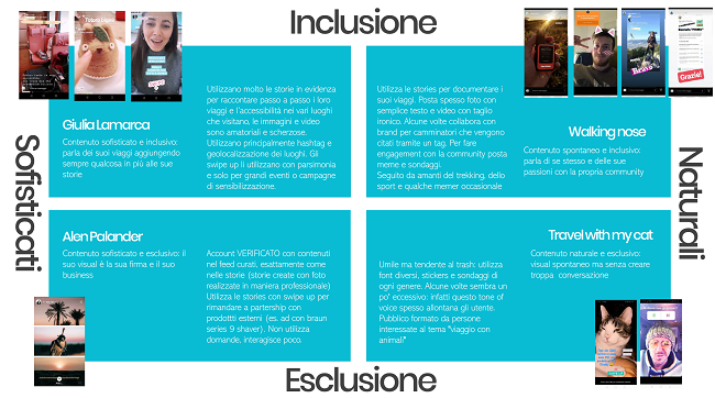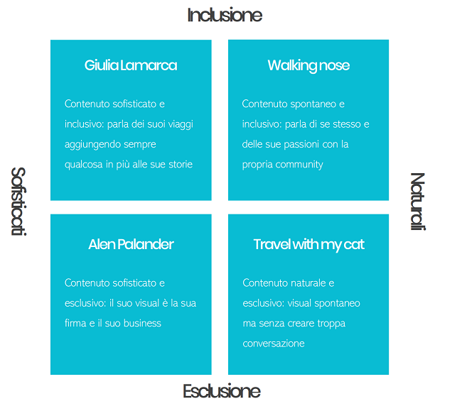 1. lungo l’asse orizzontale, INCLUSIONE vs. ESCLUSIONE. Questi due concetti sono stati scelti per studiare come i travel influencer impostano le RELAZIONI con i follower. Infatti, alcuni mirano a includere la propria community, altri invece a se la tirano!
