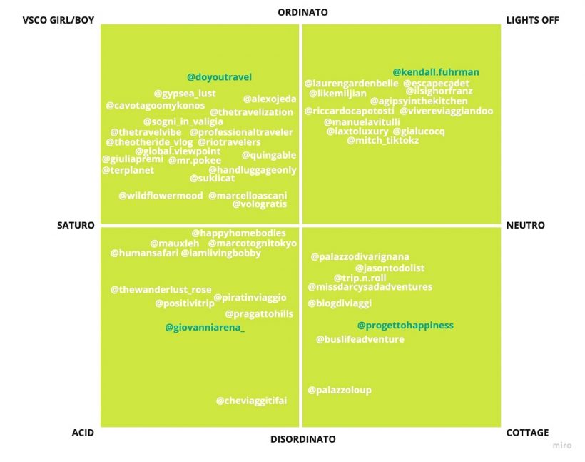 Tali metodi, trovano espressione visiva tramite il seguente quadrato di Greimas, dove possiamo visualizzare i profili dei travel content creator sopra citati e tanti altri.