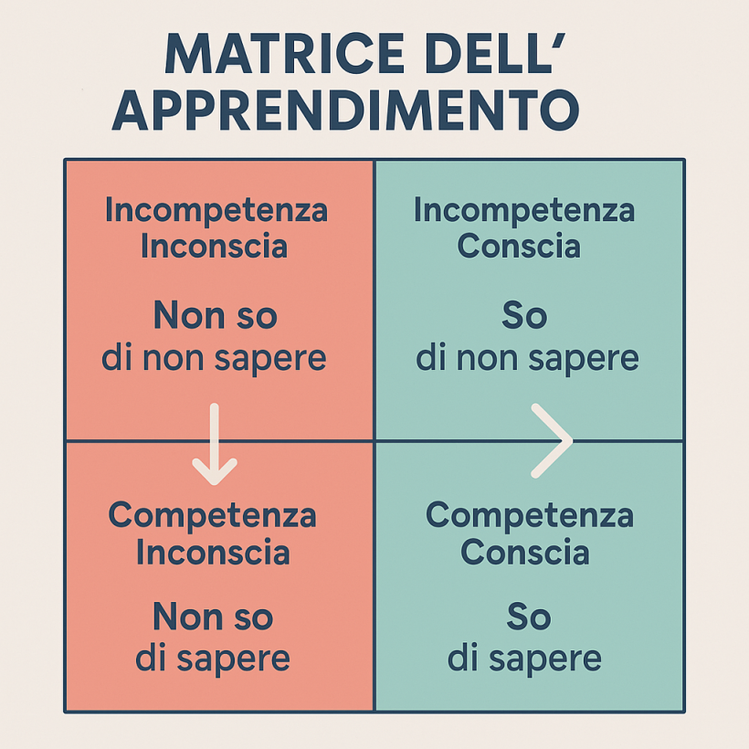 Uno dei modelli più efficaci per descrivere questo processo è la Matrice dell’Apprendimento, uno schema che aiuta a identificare le diverse fasi della consapevolezza e della competenza.