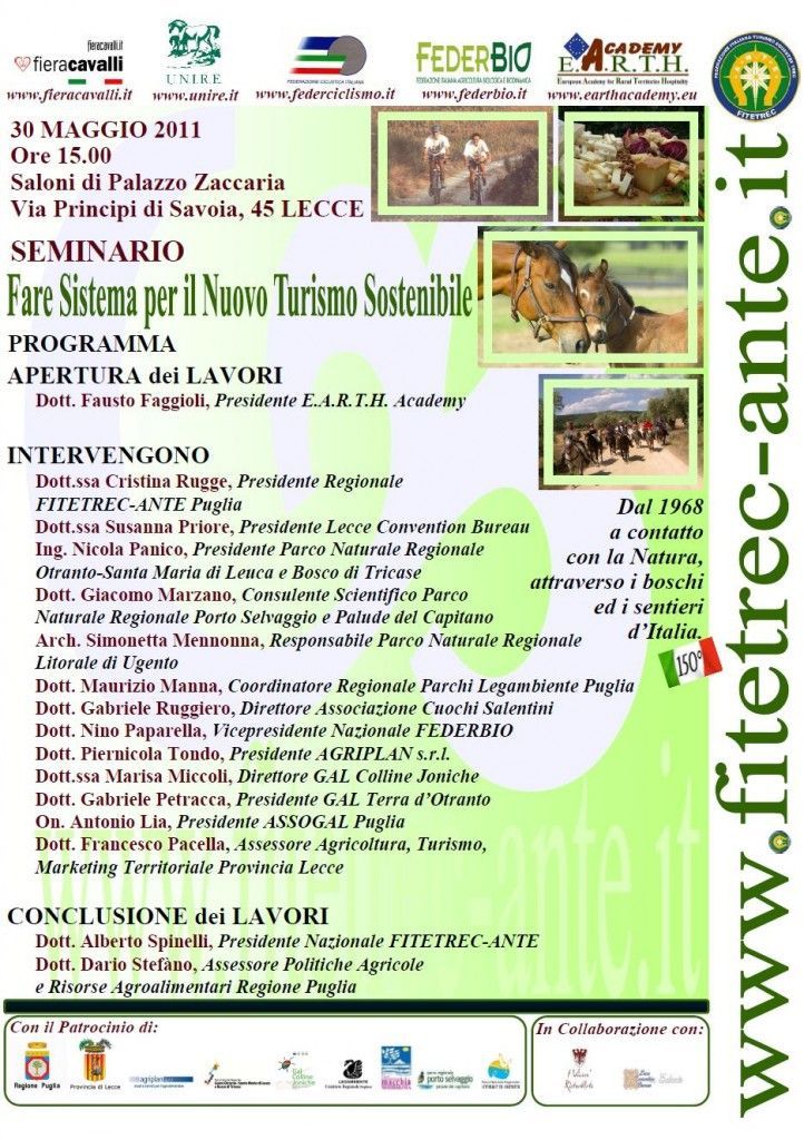 Ciclo di seminari “Fare Sistema per il nuovo turismo sostenibile”, organizzato in Puglia dalla Federazione Italiana Turismo Equestre e TREC con Earth Academy, sulle opportunità e possibilità di sviluppo delle attività ippoturistiche a completamento dell’offerta in ambito rurale.