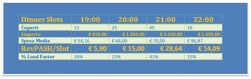 In questo modo si avrebbe una panoramica più precisa dell’evoluzione del RevPASH nel corso della cena o del pranzo e si potrebbero apportare le strategie più consone tendenti alla massimizzazione del fatturato.