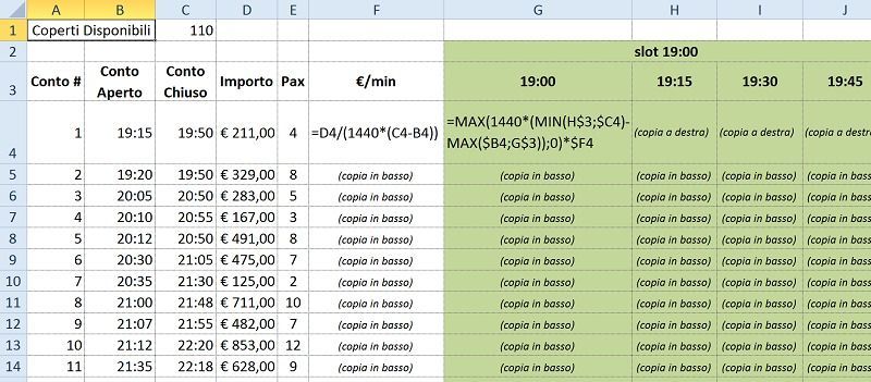 Nello schema seguente realizzato in excel, gli slot sono stati divisi per frazioni di 15 minuti, e per ogni conto è riportato l’orario di apertura e quello di chiusura del conto (reperibili dal POS).