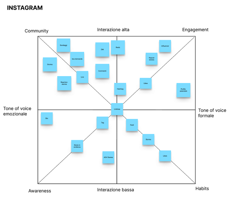 All’interno del quadrato semiotico che potete osservare in alto abbiamo analizzato le varie funzionalità offerte dalla piattaforma e le abbiamo posizionate a seconda dei risultati ottenibili utilizzando ciascuna di esse.