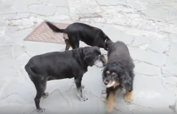 Tre “cagnine” (“mamma, zia e figlia”) interrompono Ercole mentre sta parlando e animano la piazzetta su cui si affacciano le stanze dell’albergo diffuso.